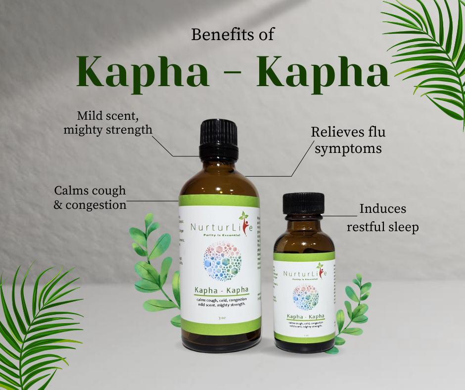 In Ayurveda, Kapha is one of the three doshas (bioenergetic principles) that govern the body's physiology and personality traits. Kapha is characterized by qualities such as heaviness, stability, coolness, and moistness. When Kapha is in balance, it promotes strength, nourishment, and stability. However, an imbalance in Kapha can lead to lethargy, congestion, weight gain, and emotional stagnation. Aromatherapy using specific **[kapha-kapha essential oil](https://nurturlife.store/pages/kapha-kapha)** can help balance Kapha dosha by promoting warmth, stimulation, and invigoration.